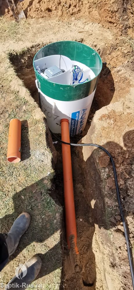 - Врезка подведенной канализационной трубы в приемную камеру септика Аквалос 4 R.