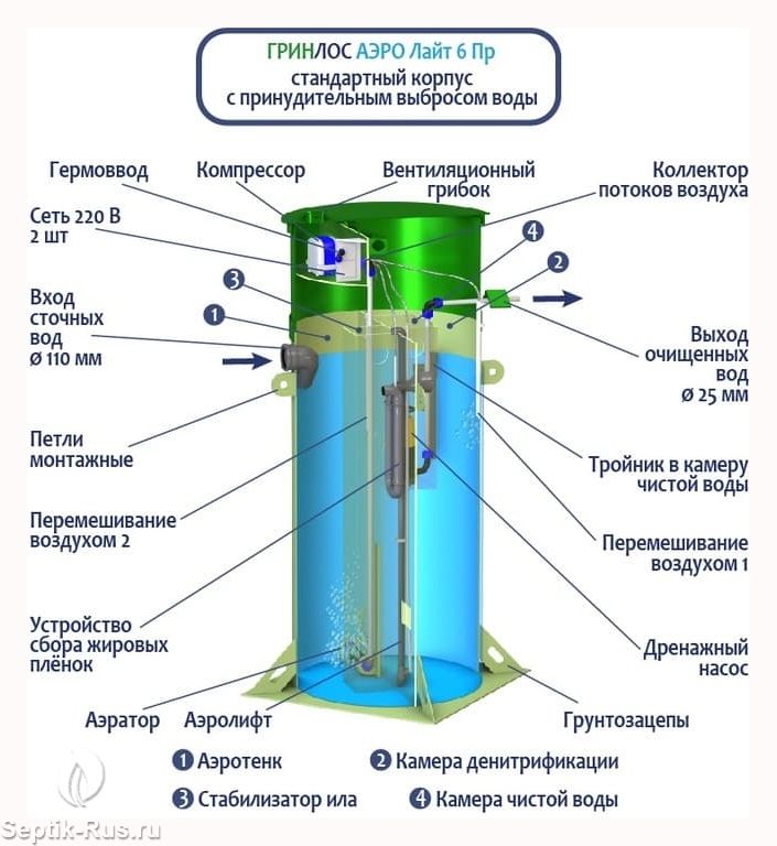 Станция Биологической Очистки Гринлос Аэро Лайт 6 Пр предназначены для расщепления и переработки основных органических загрязнений, содержащихся в бытовых сточных водах. Эти процессы происходят в результате жизнедеятельности аэробных микроорганизмов, условия для жизнедеятельности которых создает септик.