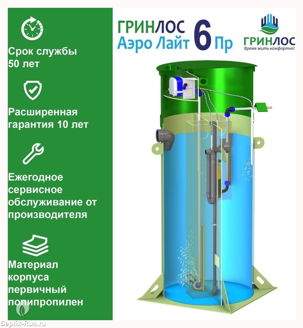 Модификация Гринлос Аэро Лайт 6 Пр выступает менее затратной в изготовлении и эксплуатации относительно септика Аэро .