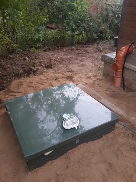 - Выемка грунта. Размер котлована рассчитываются индивидуально для каждой модели. Для септика Малахит 4 они будут составлять: ширина – 1 м (диаметр) + не менее 0.35 м, глубина – 1.84 м (высота) + песчаная подушка (+ железобетонная плита – для моделей с увеличенной высотой корпуса).