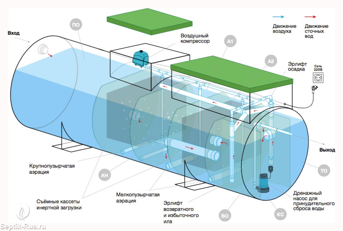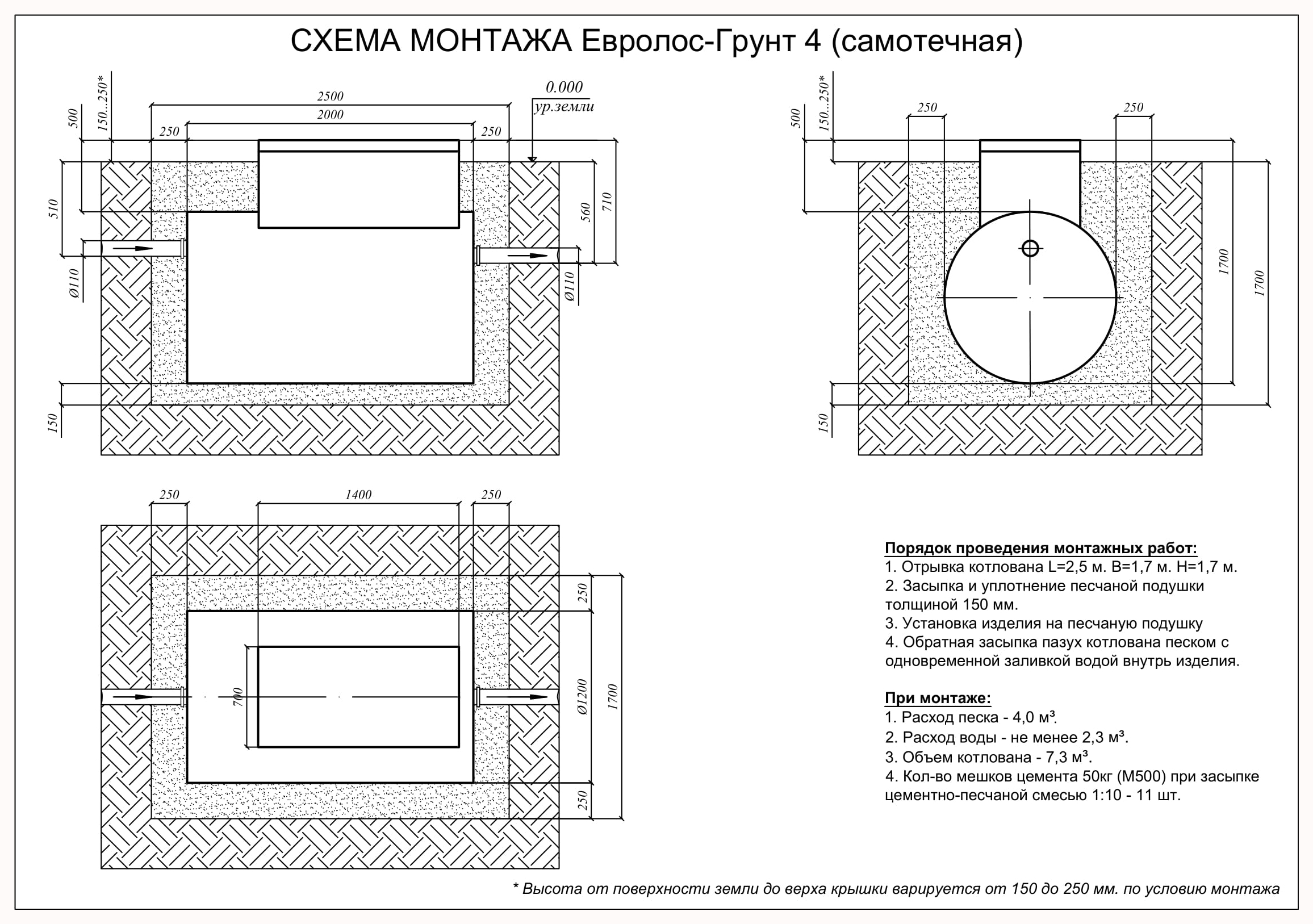 В зависимости от рельефа местности, состава грунта и условий сброса очищенной сточной воды возможны следующие варианты монтажа: